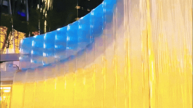 28块“7字形”亚克力单元板构成的水景系统,横贯地上和地面下沉空间,水流沿表面精雕波浪花纹潺潺而下,与灯光交织成梦幻帷幕,单块板尺寸长达7米多,厚260mm,整体亚克力规模为亚洲同类项目前列。